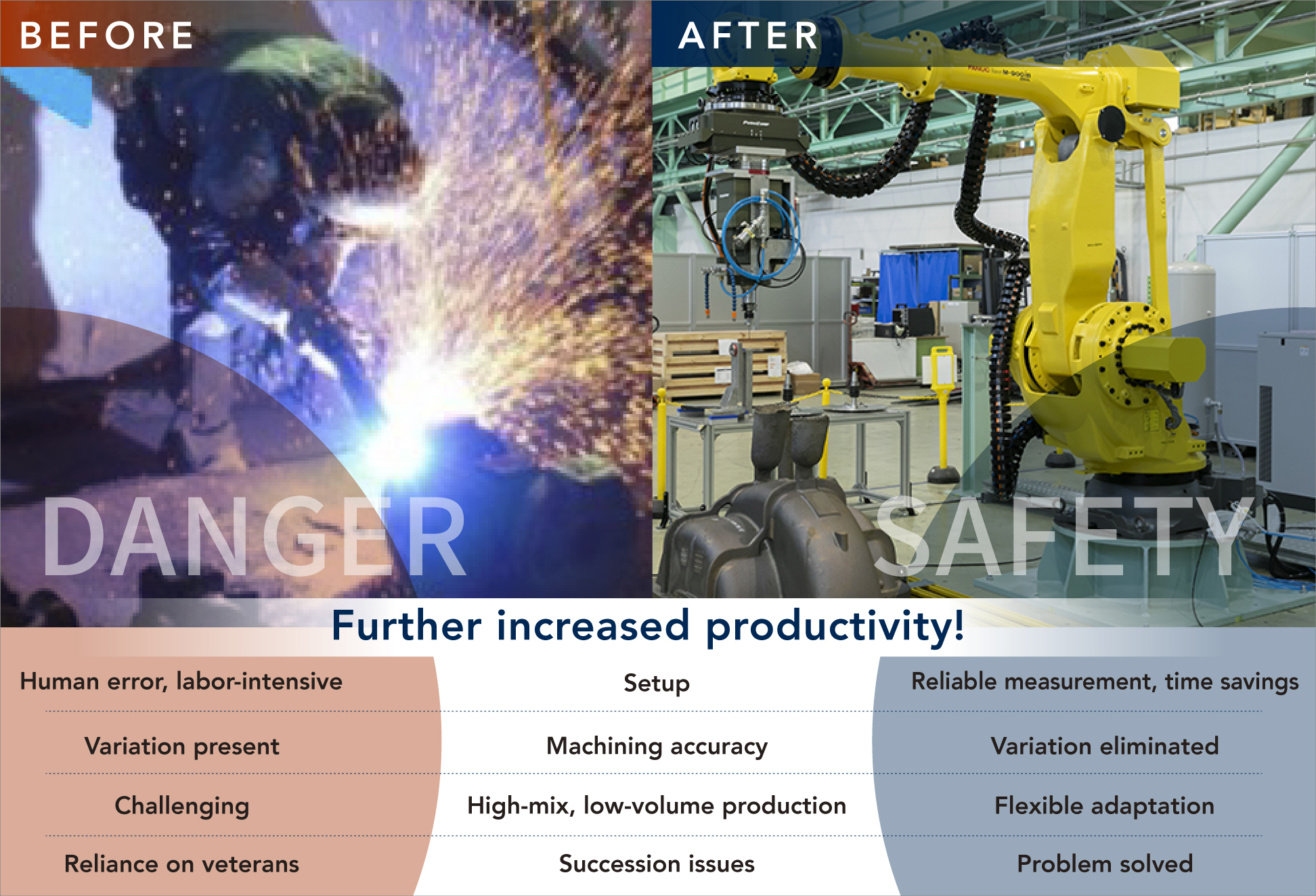 The traditional process of “manually moving, measuring, cutting, and grinding” has changed to a process of positioning with a touch probe and automatic cutting and grinding with a robot.