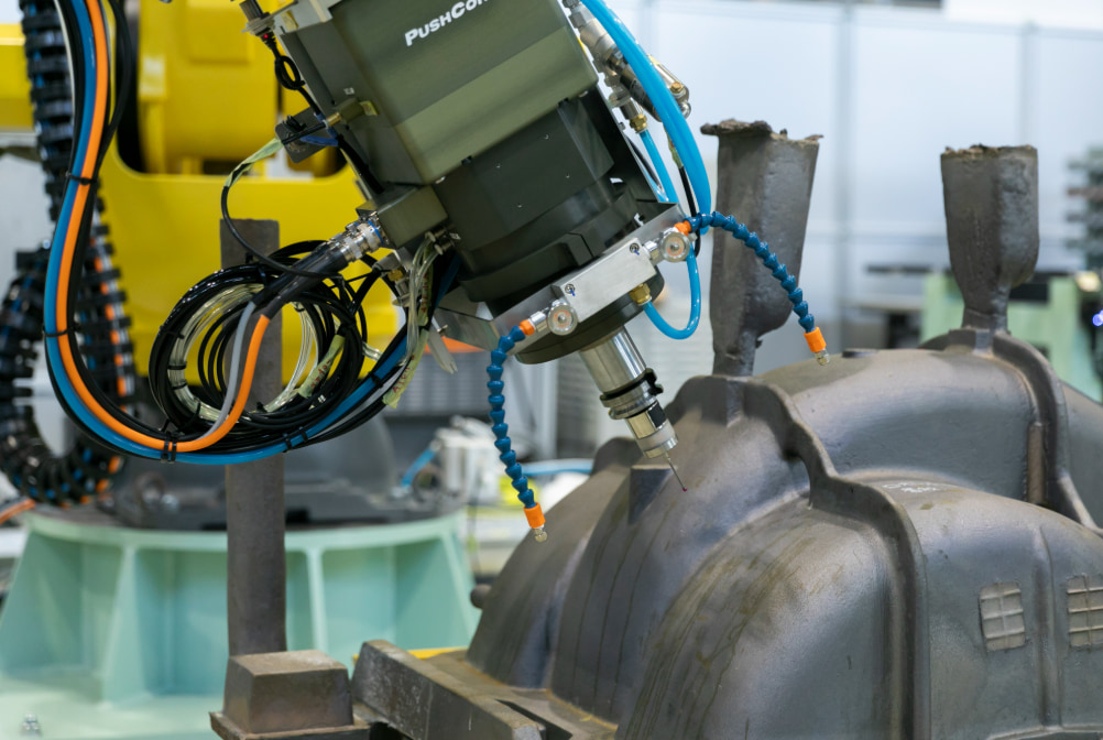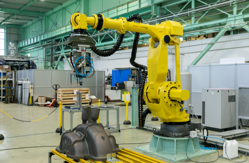 The casing is made by combining two semicircular castings of approximately 1 meter in width, depth, and height. Excess material like sprue remaining from the pouring process is removed by this robotic system.