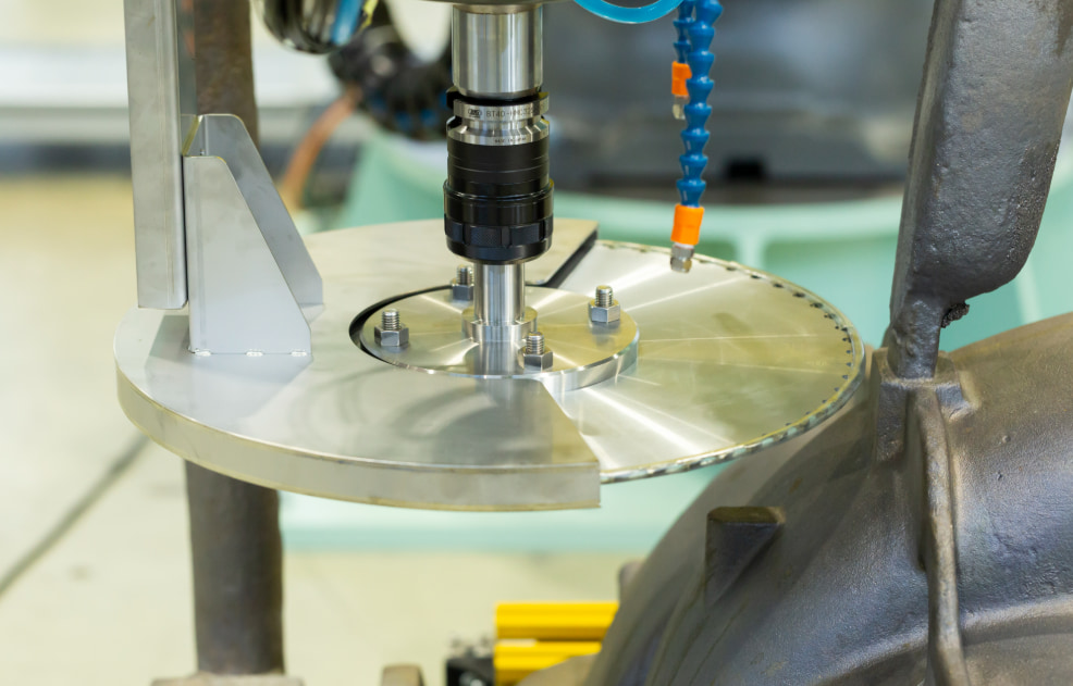 After that, the touch probe is switched to a tip saw to cut off part of the iron casing that houses the impeller of the LNG pump.